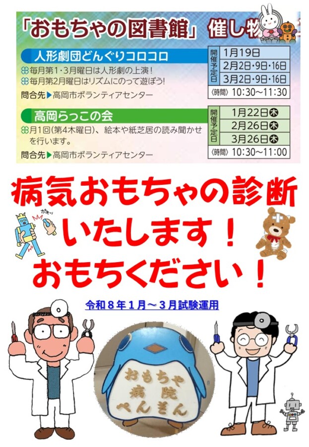 2026/01/06 【”高岡市おもちゃ図書館”で「おもちゃ病院ぺんぎん」がイベントコラボ開院!】 ”高岡市おもちゃ図書館”では、「人形劇団どんぐりコロコロ」や「らっこの会」さんが定期活動をされています。 そこで子供たちの育成に関係する活動の「おもちゃ病院ぺんぎん」も同じ活動日に”病気おもちゃの診断”を行いますので、両団体のイベントに参加される方はぜひお持ちください。 なお、令和8年1月~3月までの予定ですが、ご希望が多ければ継続を検討をいたします。