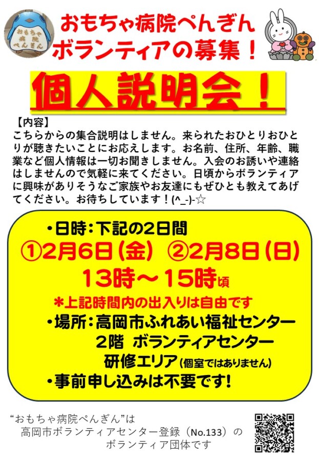 2026/01/16 【ボランティア募集!個人説明会のお知らせ】 おもちゃ病院ぺんぎんの活動に参加するにあたり、来ていただいた一人一人のみなさんが聴きたいことにお答えするだけの個人説明会です。 ちょこっとでも興味がありましたらぜひお越しくださいお待ちしています!年齢・性別に制限はありませんが、小学生以下は保護者同伴でお願いいたします(^_-)-☆