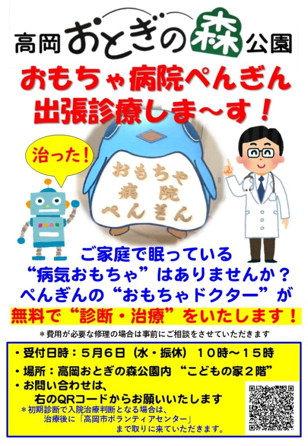 【「おもちゃ病院ぺんぎん」~高岡おとぎの森公園~出張診療のお知らせ!】