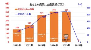 2026/04/01 【おもちゃ病院ぺんぎん 2025年度 診療活動結果】 2025年度も”おもちゃ病院ぺんぎん”をたくさんの方にご利用いただき、ありがとうございました。 受付人数は「225人」、受付おもちゃ数は「350個」、修理完了率(一部完了含む)は95%の結果となりました。 診断の結果”電池が減っていた””電池の液漏れによる故障”など、「電池トラブル」が約50%を占めており、お客様には電池の扱いについてご説明をさせていただいています。 *4月の定期診療日は「4月11日」です。どうぞご利用ください。