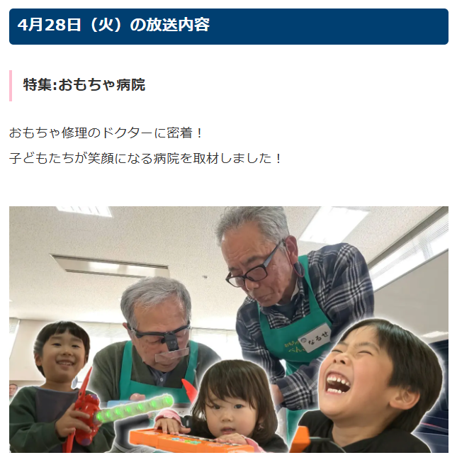 2026/04/28 【いっちゃんKNBで紹介していただきました!】 北日本放送の4月28日「いっちゃんKNB(特集コーナー)」で”おもちゃ病院ぺんぎん”の活動を紹介していただきました。 おもちゃ病院の活動の紹介はともかくとして、こわれたおもちゃを持って来た”子どもたち”の「不安な顔」と治った時の「喜びと笑顔」がとても印象的でした。 私達、ぺんぎんおもちゃドクターは、この子供たちの笑顔をエネルギーにしてこれからも楽しく活動ができることを喜びたいと思います。
