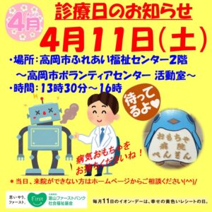 *5月は「定期診療日」はありませんが高岡市おとぎの森公園に出張診療いたしますのでそちらをご利用くださいね!。