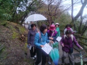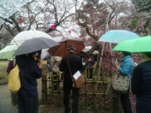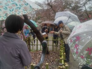 催花雨の降る中、私たち高岡観光ボランティアガイド《やまたちばな》のメンバーが高岡古城公園の桜や歴史について学んだ。
